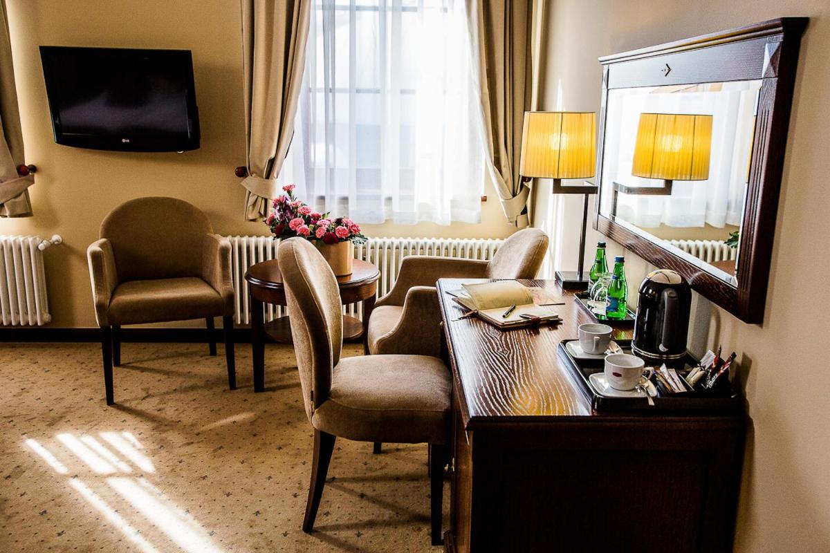 Apartament typu Junior Suite – budynek Rządcówka. Ten klimatyzowany apartament typu suite mieści salon, oddzielną sypialnię oraz łazienkę z wanną lub prysznicem. Apartament typu suite oferuje telewizor z płaskim ekranem, zestaw do parzenia kawy i herbaty, szafę, sofę oraz widok na wewnętrzny dziedziniec. Do dyspozycji Gości są 3 łóżka. Apartament typu Suite - 3 osobowy. Powierzchnia pokoju ok.: 35 mkw. ;